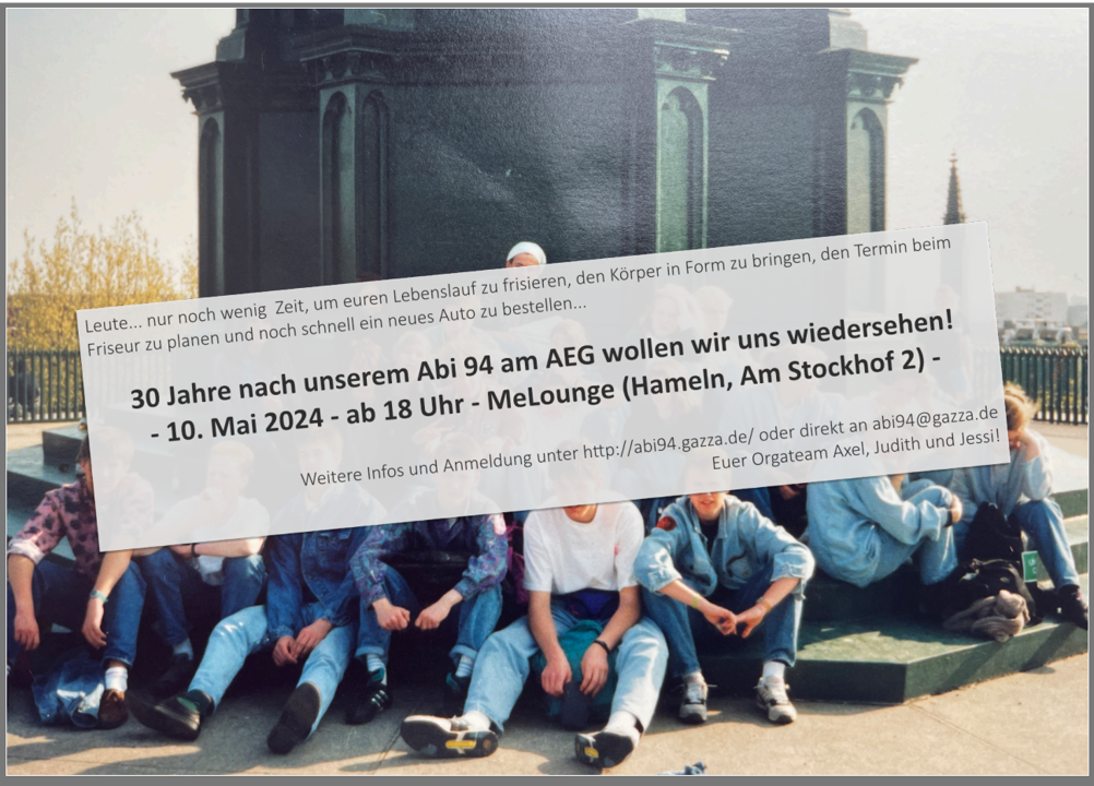 Leute – ihr habt noch Zeit um euren Lebenslauf zu frisieren, die Hanteln aus dem Keller zu holen um den Körper in Form zu bringen, den Termin beim Friseur zu planen und noch schnell ein neues Auto zu bestellen – nach 30 Jahren wollen wir uns am 10.05.2024 in der MeLounge in Hameln noch einmal sehen.
